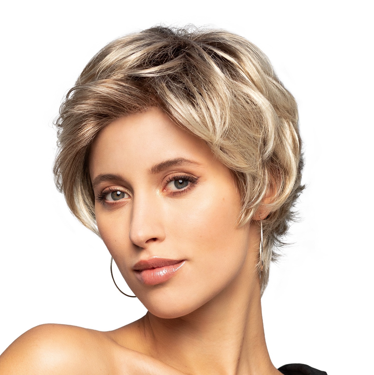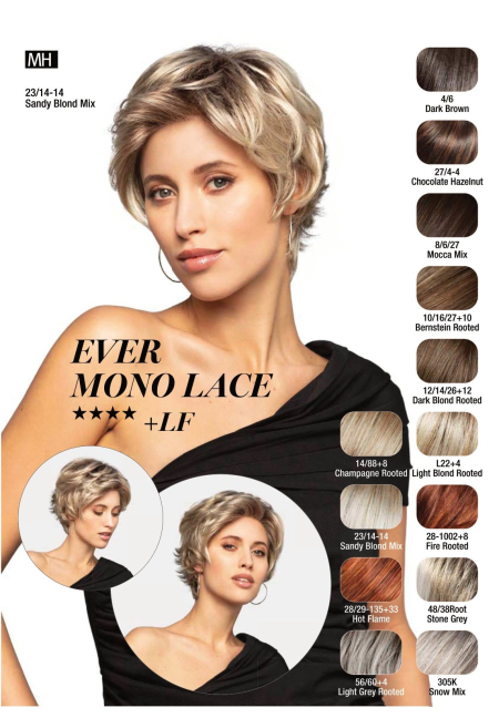 Lace front, monofilament: elől, a hajkezdetnél és a fejtető egészén fejbőr hatású tüll anyaggal, így a homlokból kifésülhető és a választék tetszőlegesen fésülhető