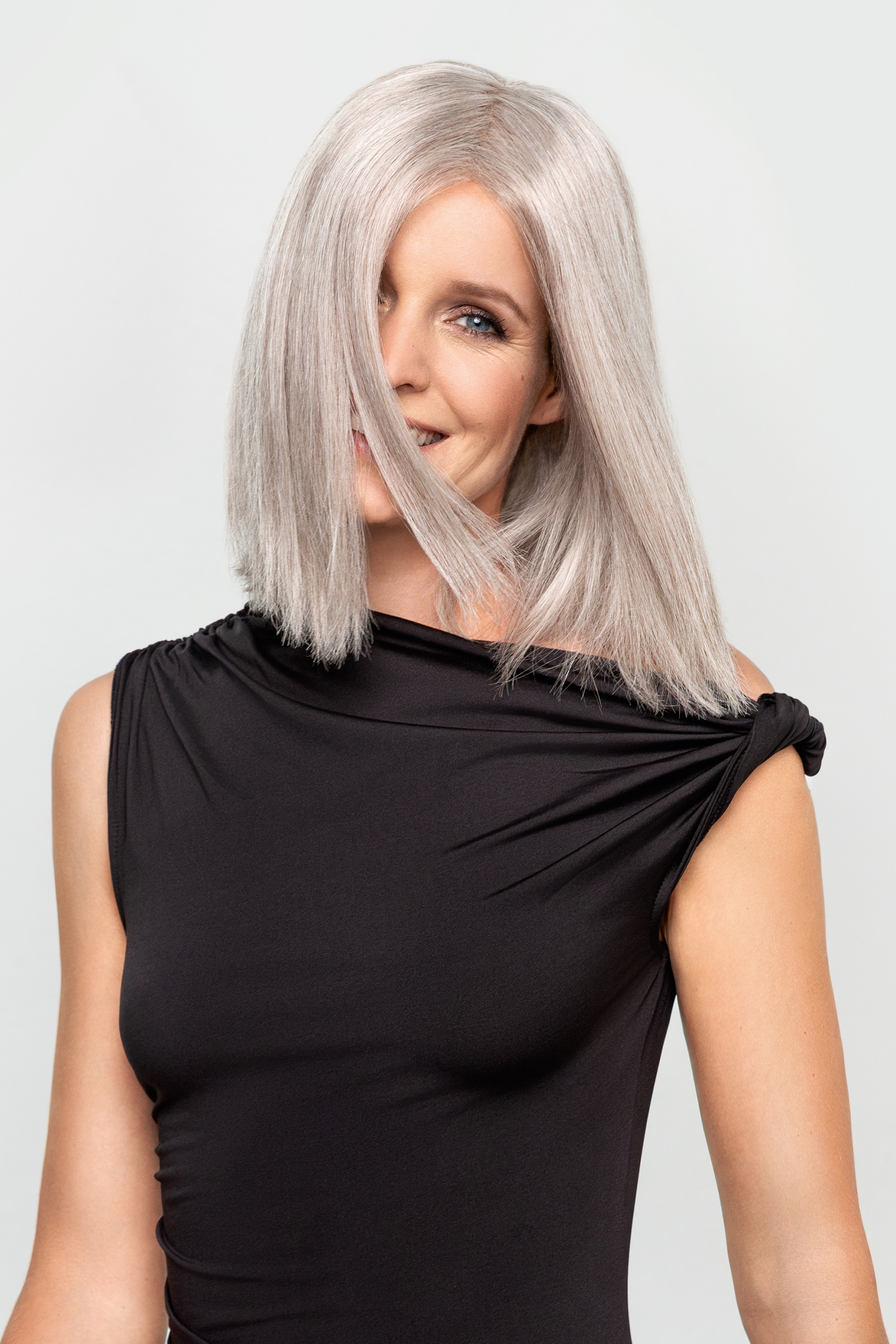 Lace front, monofilament: a homlokvonalnál, a haj kezdetnél és a fejtető egészén fejbőr hatású tüll anyaggal, így a választék tetszőlegesen fésülhető.