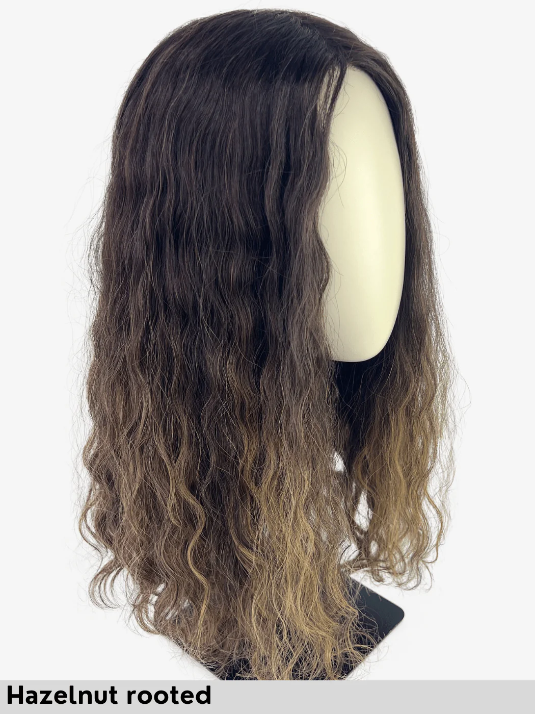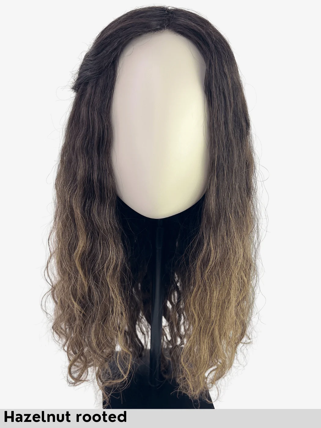 Lace front, monofilament: a homlokvonalnál, a haj kezdetnél és a fejtető egészén fejbőr hatású tüll anyaggal, így a választék tetszőlegesen fésülhető