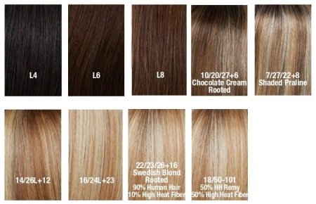 Lace front, monofilament: a homlokvonalnál, a haj kezdetnél és a fejtető egészén fejbőr hatású tüll anyaggal, így a választék tetszőlegesen fésülhető
